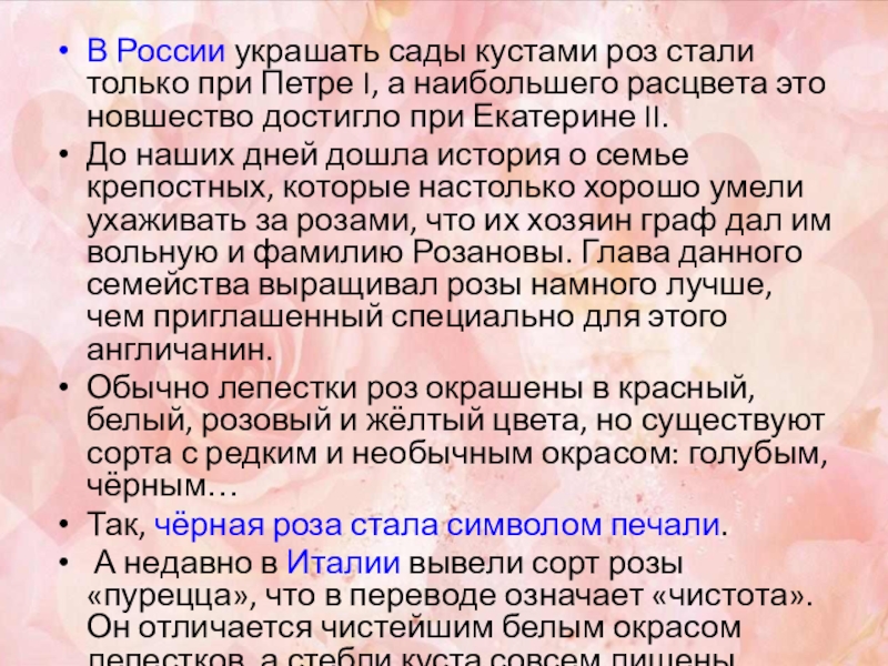 Слайд 22В России украшать сады кустами роз стали только при Петре I,