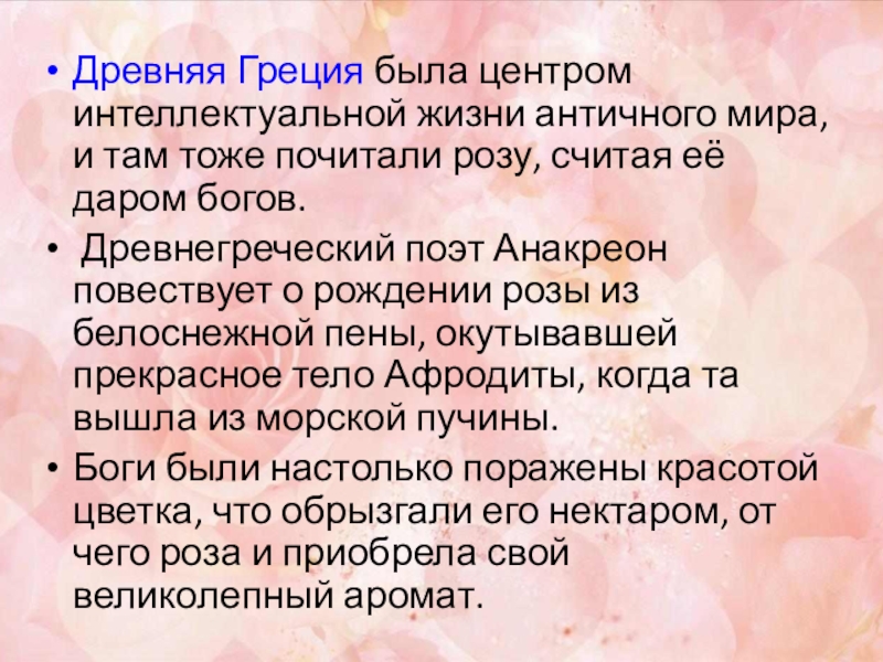 Древнегреческий поэт Анакреон повествует о рождении розы из белоснежной пены, окутывавшей прекрасное тело Афродиты, когда та вышла из морской пучины.
