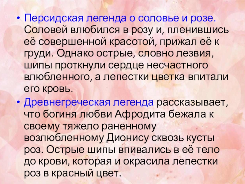 Слайд 12Персидская легенда о соловье и розе. Соловей влюбился в розу и,