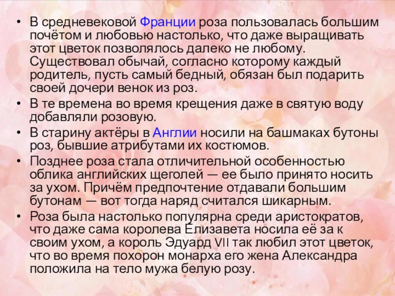 Слайд 18В средневековой Франции роза пользовалась большим почётом и любовью настолько, что