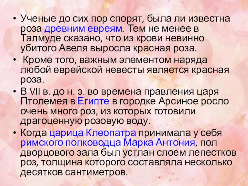 Слайд 8Ученые до сих пор спорят, была ли известна роза древним евреям.