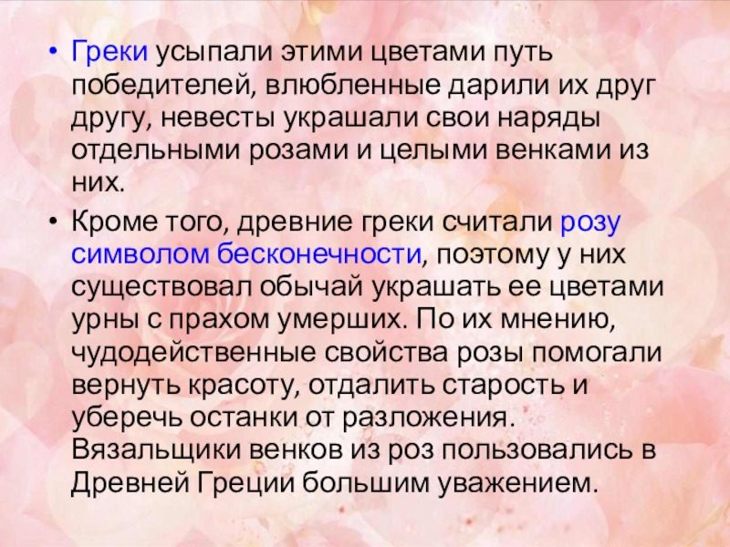 Кроме того, древние греки считали розу символом бесконечности, поэтому у них существовал обычай украшать ее цветами урны с прахом умерших. По их мнению, чудодейственные свойства розы помогали вернуть красоту, отдалить старость и уберечь останки от разложения. Вязальщики венков из роз пользовались в Древней Греции большим уважением.