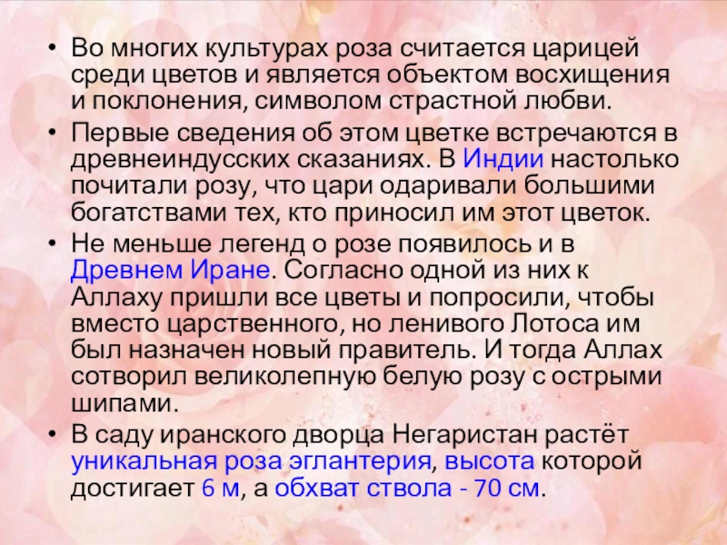 Слайд 4Во многих культурах роза считается царицей среди цветов и является объектом