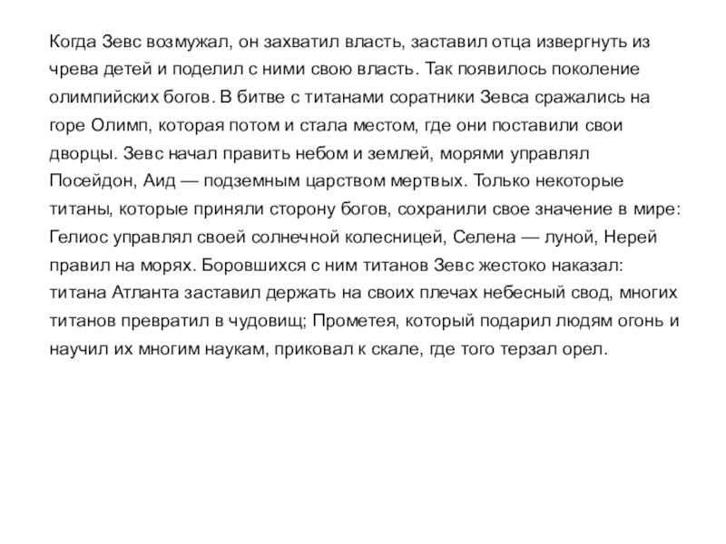 детей и поделил с ними свою власть. Так появилось поколение олимпийских богов. В битве с титанами соратники Зевса сражались на горе Олимп, которая потом и стала местом, где они поставили свои дворцы. Зевс начал править небом и землей, морями управлял Посейдон, Аид — подземным царством мертвых. Только некоторые титаны, которые приняли сторону богов, сохранили свое значение в мире: Гелиос управлял своей солнечной колесницей, Селена — луной, Нерей правил на морях. Боровшихся с ним титанов Зевс жестоко наказал: титана Атланта заставил держать на своих плечах небесный свод, многих титанов превратил в чудовищ; Прометея, который подарил людям огонь и научил их многим наукам, приковал к скале, где того терзал орел.