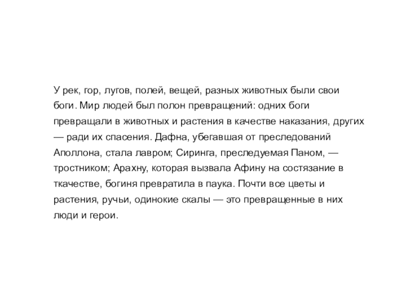 Мир людей был полон превращений: одних боги превращали в животных и растения в качестве наказания, других — ради их спасения. Дафна, убегавшая от преследований Аполлона, стала лавром; Сиринга, преследуемая Паном, — тростником; Арахну, которая вызвала Афину на состязание в ткачестве, богиня превратила в паука. Почти все цветы и растения, ручьи, одинокие скалы — это превращенные в них люди и герои.