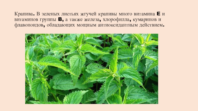 Слайд 8Крапива. В зеленых листьях жгучей крапивы много витамина E и витаминов