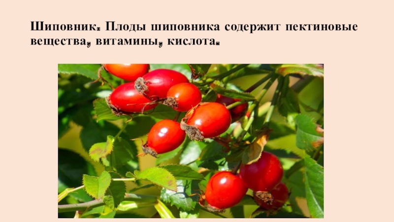 Слайд 11Шиповник. Плоды шиповника содержит пектиновые вещества, витамины, кислота.