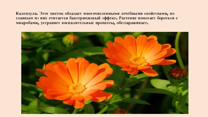 Слайд 10 Календула. Этот цветок обладает многочисленными лечебными свойствами, но главным из них