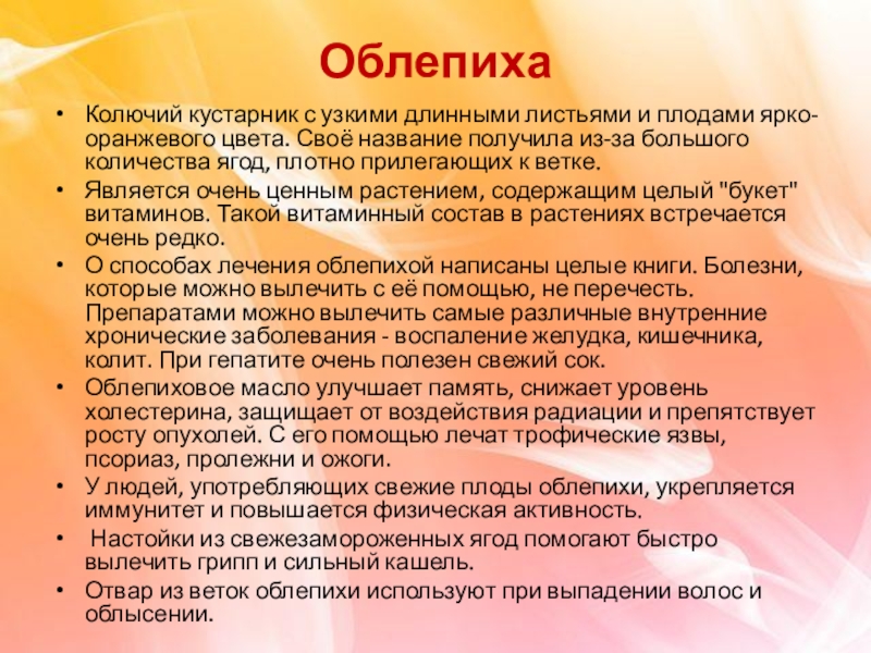 О способах лечения облепихой написаны целые книги. Болезни, которые можно вылечить с её помощью, не перечесть. Препаратами можно вылечить самые различные внутренние хронические заболевания - воспаление желудка, кишечника, колит. При гепатите очень полезен свежий сок.