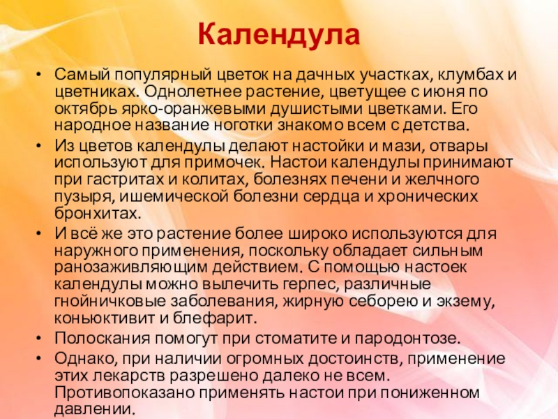 Из цветов календулы делают настойки и мази, отвары используют для примочек. Настои календулы принимают при гастритах и колитах, болезнях печени и желчного пузыря, ишемической болезни сердца и хронических бронхитах.