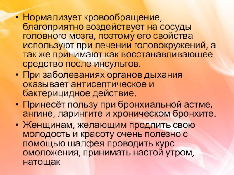 Слайд 4Нормализует кровообращение, благоприятно воздействует на сосуды головного мозга, поэтому его свойства