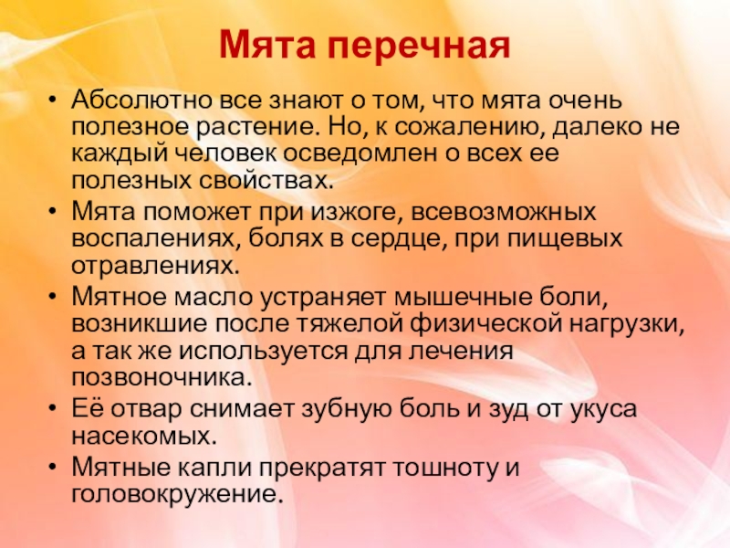 Мята поможет при изжоге, всевозможных воспалениях, болях в сердце, при пищевых отравлениях.