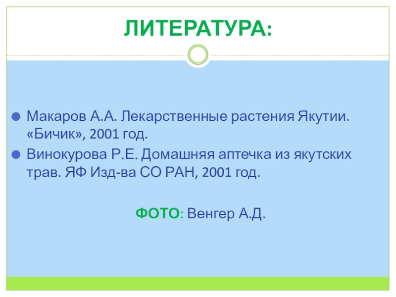 Макаров А.А. Лекарственные растения Якутии. «Бичик», 2001 год.