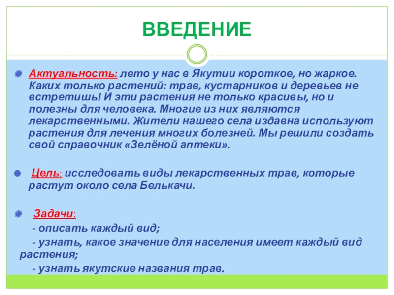 Цель: исследовать виды лекарственных трав, которые растут около села Белькачи.