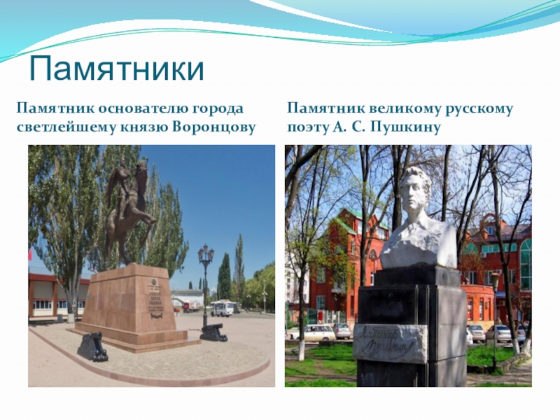 ПамятникиПамятник основателю города светлейшему князю ВоронцовуПамятник великому русскому поэту А. С. Пушкину
