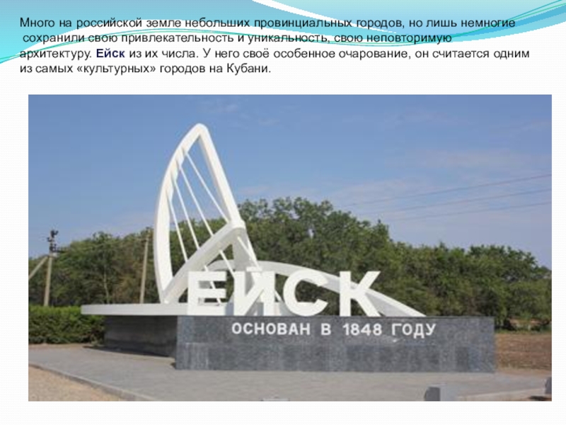 Много на российской земле небольших провинциальных городов, но лишь немногие сохранили свою привлекательность и уникальность, свою неповторимую архитектуру. Ейск из их числа. У него своё особенное очарование, он считается одним из самых «культурных» городов на Кубани.