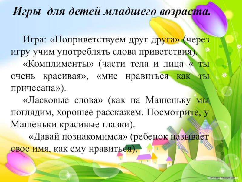 «Комплименты» (части тела и лица « ты очень красивая», «мне нравиться как ты причесана»). «Ласковые слова» (как на Машеньку мы поглядим, хорошее расскажем. Посмотрите, у Машеньки красивые глазки).