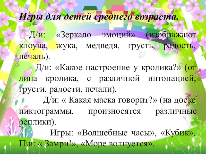 Д/и: «Зеркало эмоций» (изображают клоуна, жука, медведя, грусть, радость, печаль).