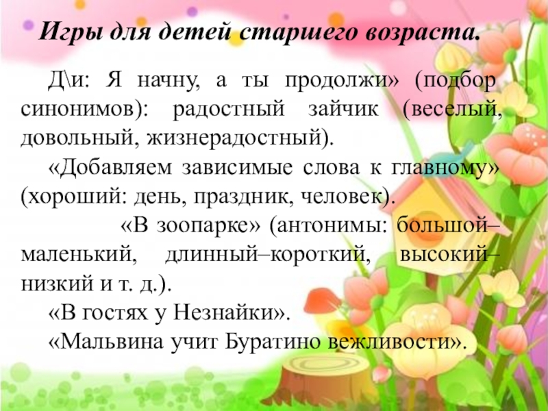 «В зоопарке» (антонимы: большой– маленький, длинный–короткий, высокий–низкий и т. д.).
