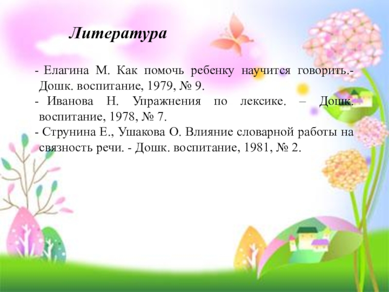 Литература Елагина М. Как помочь ребенку научится говорить.- Дошк. воспитание, 1979, № 9. Иванова Н. Упражнения по