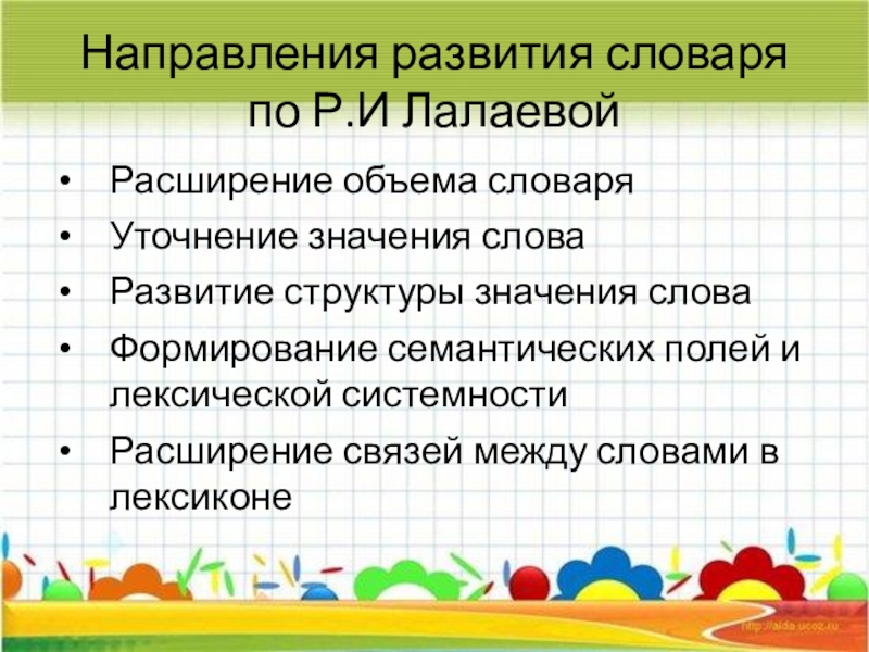 Слайд 15Направления развития словаря по Р.И Лалаевой