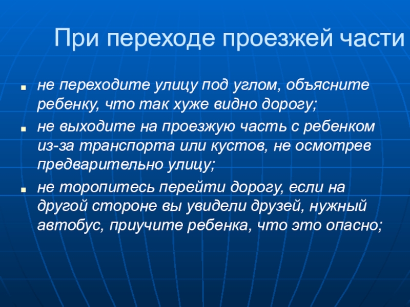 не выходите на проезжую часть с ребенком из-за транспорта или кустов, не осмотрев предварительно улицу;