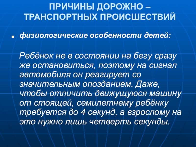 Ребёнок не в состоянии на бегу сразу же остановиться, поэтому на сигнал автомобиля он реагирует со значительным опозданием. Даже, чтобы отличить движущуюся машину от стоящей, семилетнему ребёнку требуется до 4 секунд, а взрослому на это нужно лишь четверть секунды.