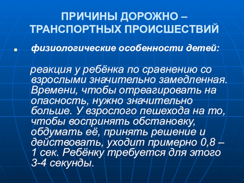 реакция у ребёнка по сравнению со взрослыми значительно замедленная. Времени, чтобы отреагировать на опасность, нужно значительно больше. У взрослого пешехода на то, чтобы воспринять обстановку, обдумать её, принять решение и действовать, уходит примерно 0,8 – 1 сек. Ребёнку требуется для этого 3-4 секунды.