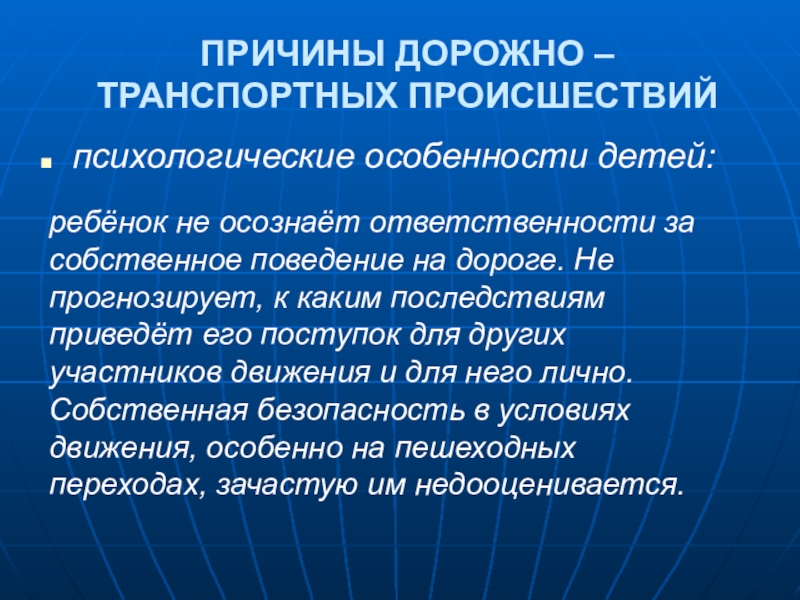 ответственности за собственное поведение на дороге. Не прогнозирует, к каким последствиям приведёт его поступок для других участников движения и для него лично. Собственная безопасность в условиях движения, особенно на пешеходных переходах, зачастую им недооценивается.