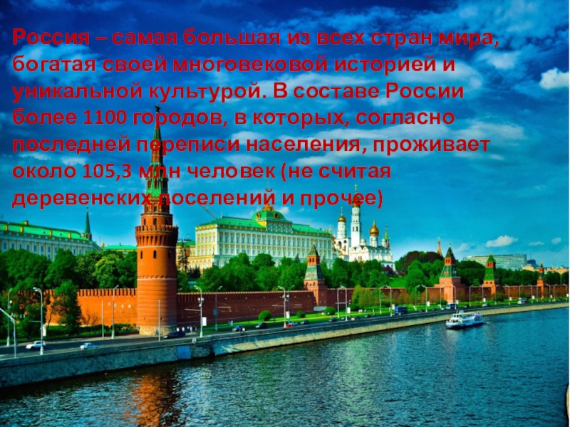 историей и уникальной культурой. В составе России более 1100 городов, в которых, согласно последней переписи населения, проживает около 105,3 млн человек (не считая деревенских поселений и прочее)