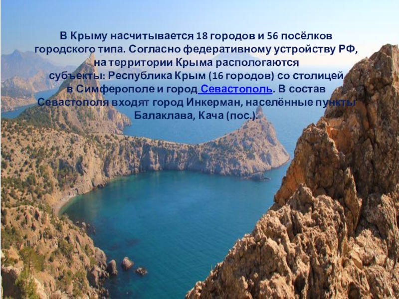 Слайд 8В Крыму насчитывается 18 городов и 56 посёлков городского типа. Согласно федеративному устройству