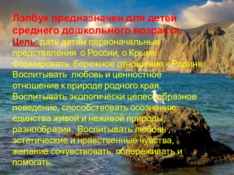 Лэпбук предназначен для детей среднего дошкольного возраста.Цель: дать детям первоначальные представления о России, о Крыме. Формировать бережное отношение к Родине. Воспитывать любовь и ценностное отношение к природе родного края. Воспитывать экологически целесообразное поведение, способствовать осознанию единства