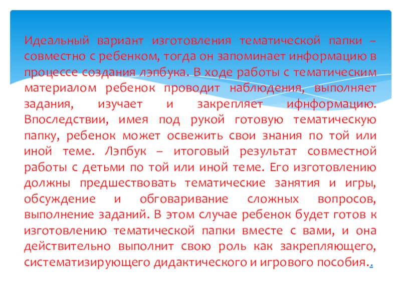 Слайд 2Идеальный вариант изготовления тематической папки – совместно с ребенком, тогда он