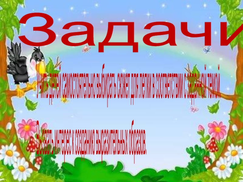 ЗадачиУчить детей самостоятельно выбирать сюжет для лепки в соответствии с заданной темой.Вызвать интерес к созданию выразительных образов.