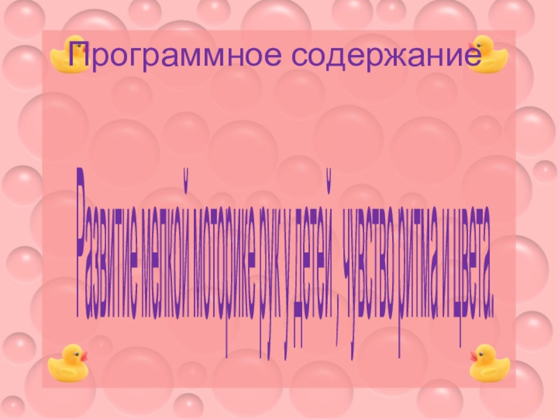 Программное содержаниеРазвитие мелкой моторике рук у детей , чувство ритма и цвета.