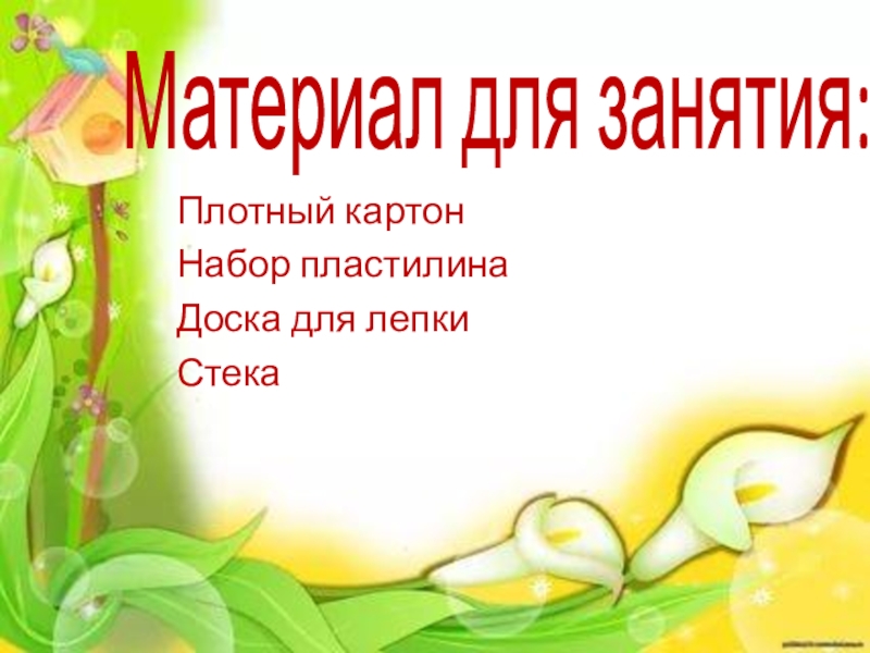Материал для занятия:Плотный картонНабор пластилинаДоска для лепкиСтека