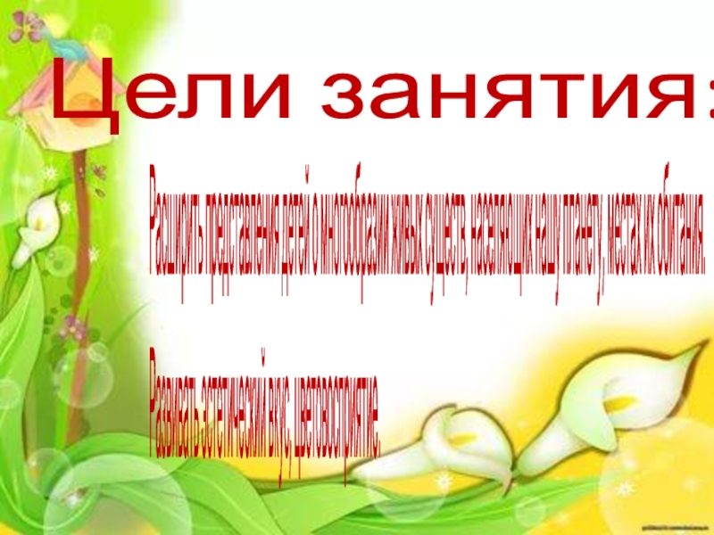 Цели занятия:Расширить представления детей о многообразии живых существ, населяющих нашу планету, местах их обитания.Развивать эстетический вкус, цветовосприятие.