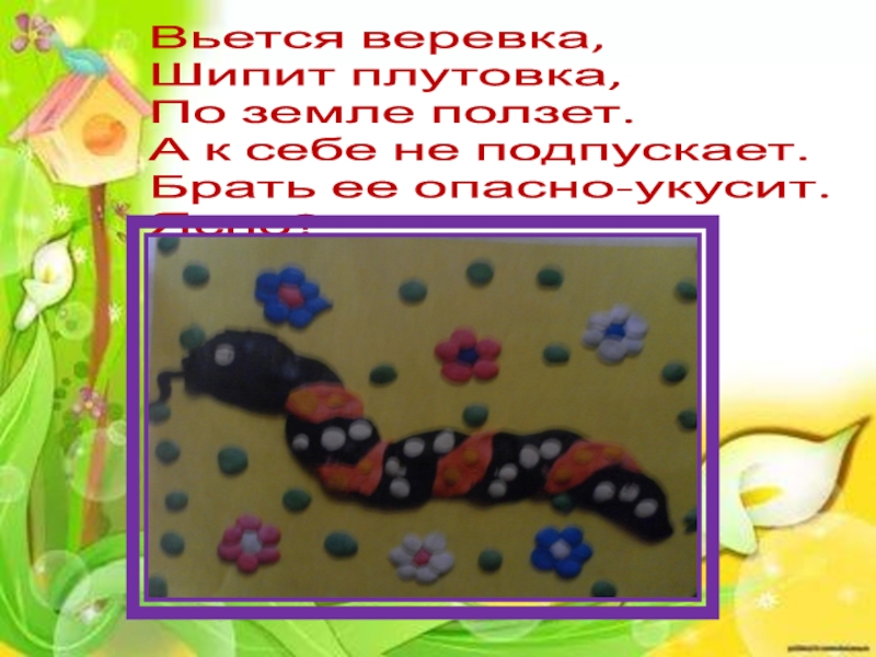 Слайд 4Вьется веревка, Шипит плутовка, По земле ползет. А к себе не подпускает. Брать ее опасно-укусит. Ясно?