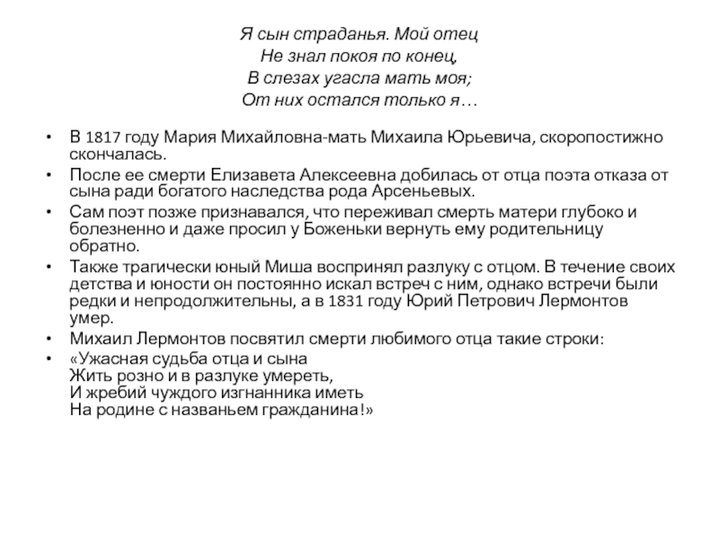 Михаил Лермонтов посвятил смерти любимого отца такие строки: