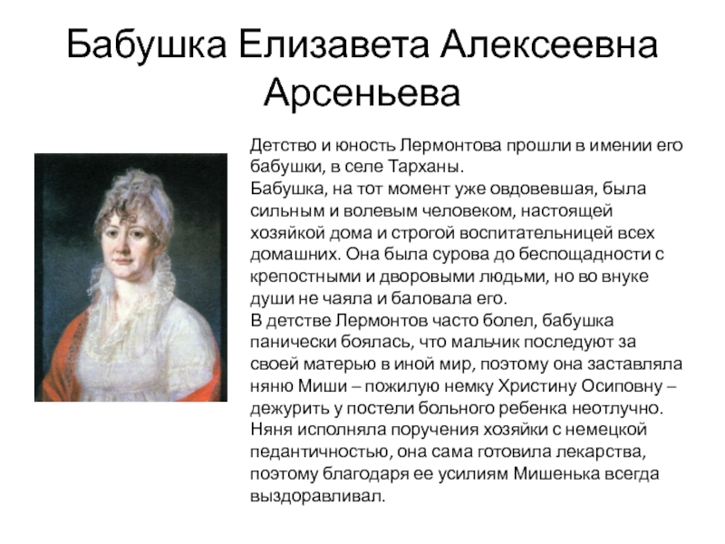 После ее смерти Елизавета Алексеевна добилась от отца поэта отказа от сына ради богатого наследства рода Арсеньевых.