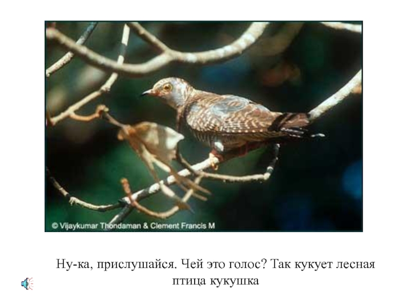 Слайд 3Ну-ка, прислушайся. Чей это голос? Так кукует лесная