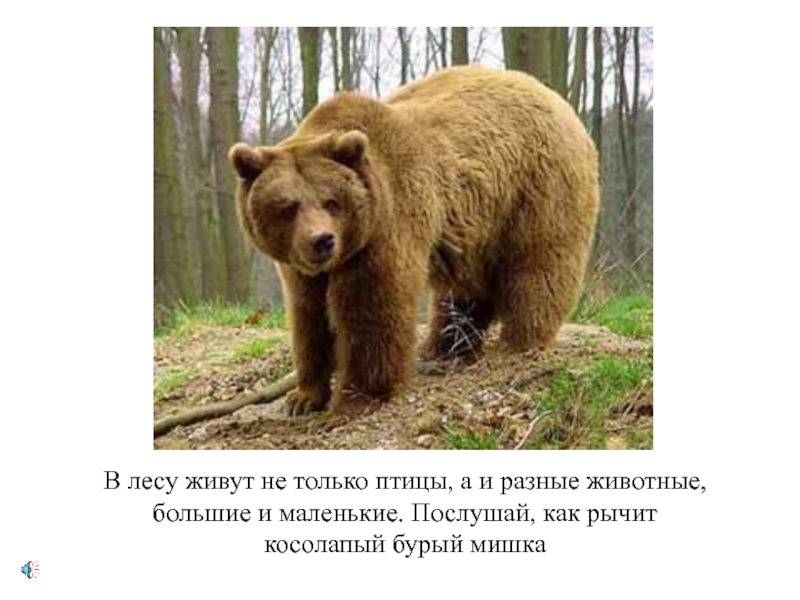 В лесу живут не только птицы, а и разные животные,большие и маленькие. Послушай, как рычиткосолапый бурый мишка