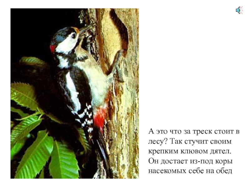 А это что за треск стоит в лесу? Так стучит своимкрепким клювом дятел. Он достает из-под коры