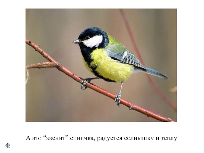 Слайд 5А это “звенит” синичка, радуется солнышку и теплу