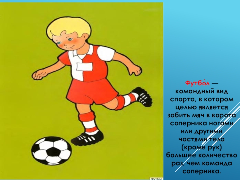 Слайд 9Футбо́л — командный вид спорта, в котором целью является забить мяч в