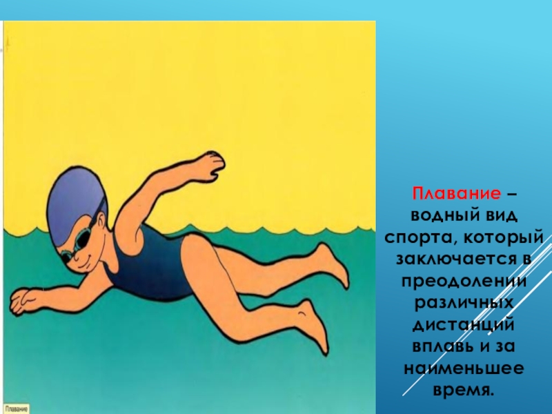 Слайд 6Плавание – водный вид спорта, который заключается в преодолении различных дистанций вплавь