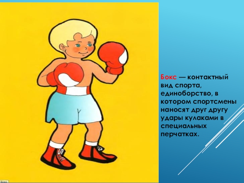 Слайд 4Бокс — контактный вид спорта, единоборство, в котором спортсмены наносят друг другу