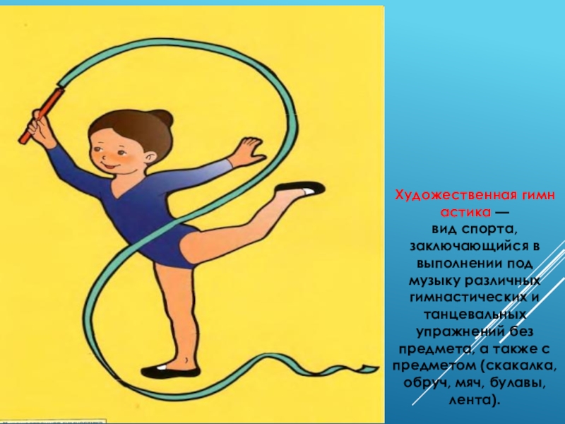 Художественная гимнастика — вид спорта, заключающийся в выполнении под музыку различных гимнастических и танцевальных упражнений без предмета, а также