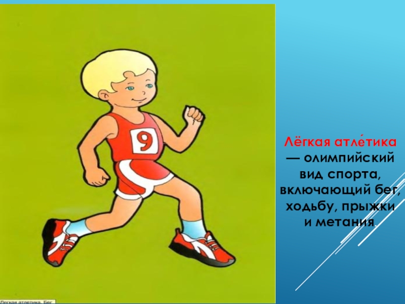 Слайд 7Лёгкая атле́тика — олимпийский вид спорта, включающий бег, ходьбу, прыжки и метания.