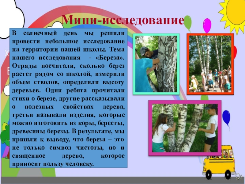 школы. Тема нашего исследования - «Береза». Отряды посчитали, сколько берез растет рядом со школой, измерили объем стволов, определили высоту деревьев. Одни ребята прочитали стихи о березе, другие рассказывали о полезных свойствах дерева, третьи называли изделия, которые можно изготовить из коры, бересты, древесины березы. В результате, мы пришли к выводу, что береза – это не только символ чистоты, но и священное дерево, которое приносит пользу человеку.